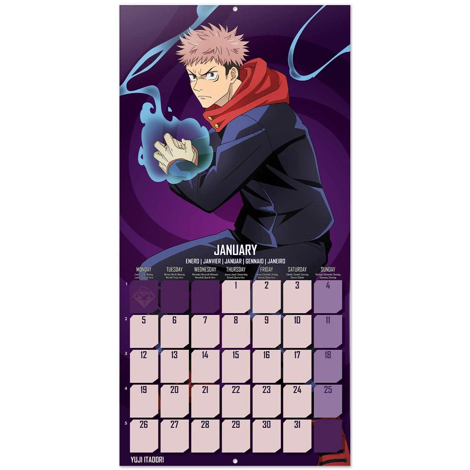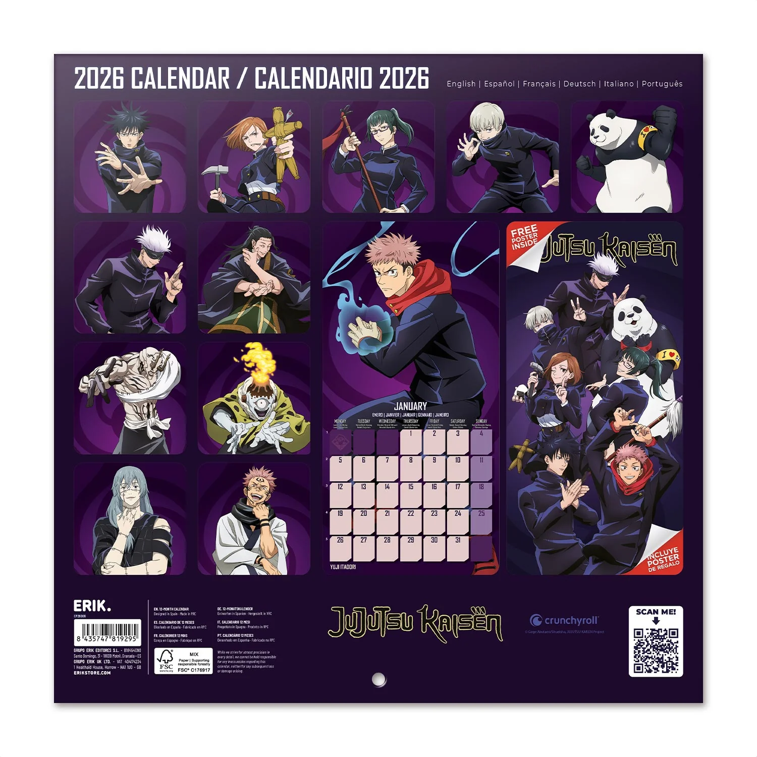 Μπείτε στον κόσμο των Gojo, Yuji, Megumi και Nobara με το Jujutsu Kaisen Calendar 2026 – ένα έντονο ημερολόγιο τοίχου 29,5 x 29,5 εκ. γεμάτο με εμβληματικές εικόνες anime. Με άλλα λόγια: κάθε μήνας φέρνει την ατμόσφαιρα του Jujutsu High στον τοίχο σας – σκοτεινή, κομψή και γεμάτη ενέργεια.