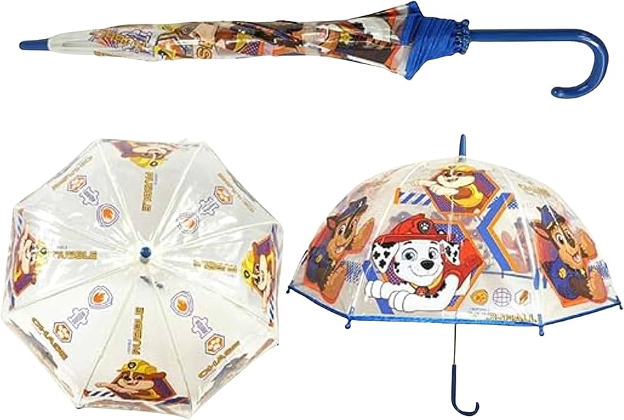• Διαφανής ομπρέλα τυπωμένη με σχέδια Paw Patrol. Το μικρό σας θα θέλει βροχή κάθε μέρα για να βγει έξω με αυτή την ομπρέλα διαμέτρου 46 εκατοστών. Έχει ένα φουσκωτό σχήμα που ενισχύει τη αντίσταση στο νερού και το εμποδίζει να βραχεί. Επιπλέον, ο μακρύς άξονας του με λαβή γάντζου το καθιστά εύκολο στη μεταφορά και το κράτημα.