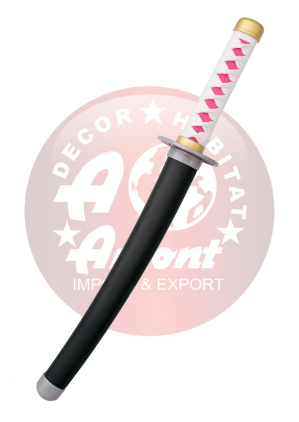 Μίνι κατάνα Kanao Tsuyuri από την Demon Slayer. Αντίγραφο 40 εκ. ατσάλινης λεπίδας με ροζ φινίρισμα και σατέν άκρη, λαβή με λευκό κορδόνι και απομίμηση ροζ ριγέ δέρματος, με μαύρη θήκη και ασημένιες λεπτομέρειες. Η Kanao Tsuyuri είναι μια Demon Slayer, η θετή αδερφή της Kanae Kocho και του Shinobu Kocho, και μια Tsuguko.