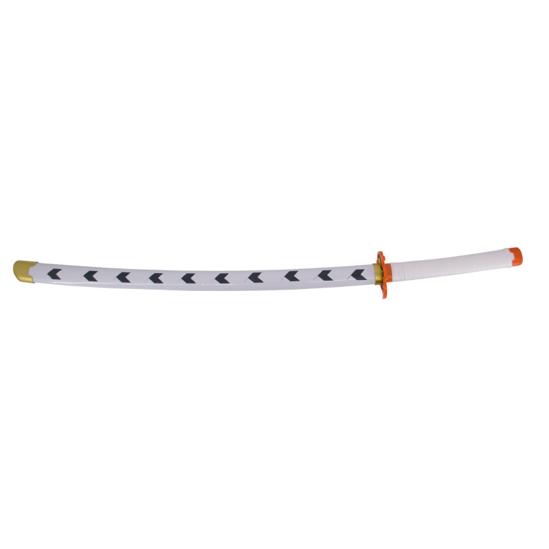 Demon Slayer Katana S5037 με χειριστή τον Rengoku Kyoujurou, ανεπίσημο αντίγραφο λεπίδας από μπαμπού 105 cm, λαβή με λευκό κορδόνι από δερματίνη και λευκή θήκη με λεπτομέρειες.