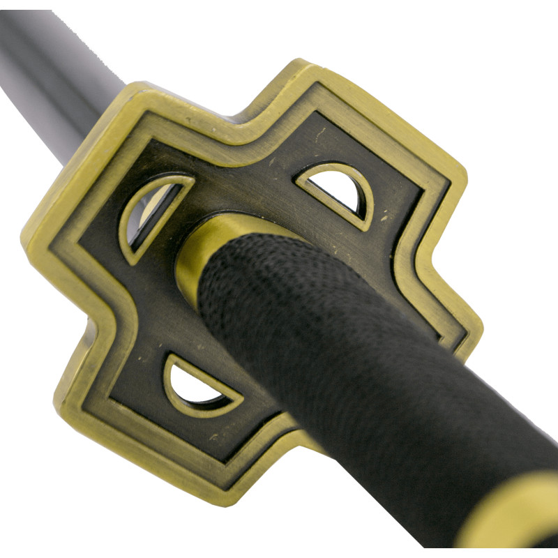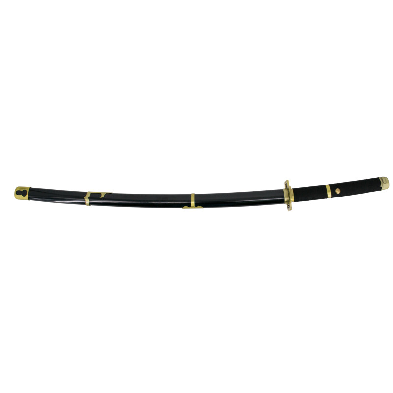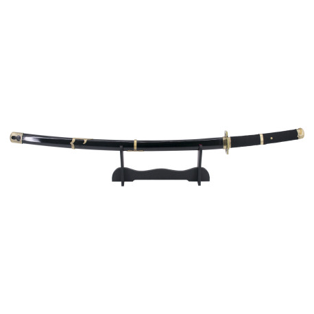 Katana Yubashiri Zoro από One Piece, αντίγραφο ατσάλινης λάμας 103 cm σε μαύρο χρώμα με σατέν οδοντώσεις, λαβή με μαύρο κορδόνι και ξύλινη βάση-στήριγμα.