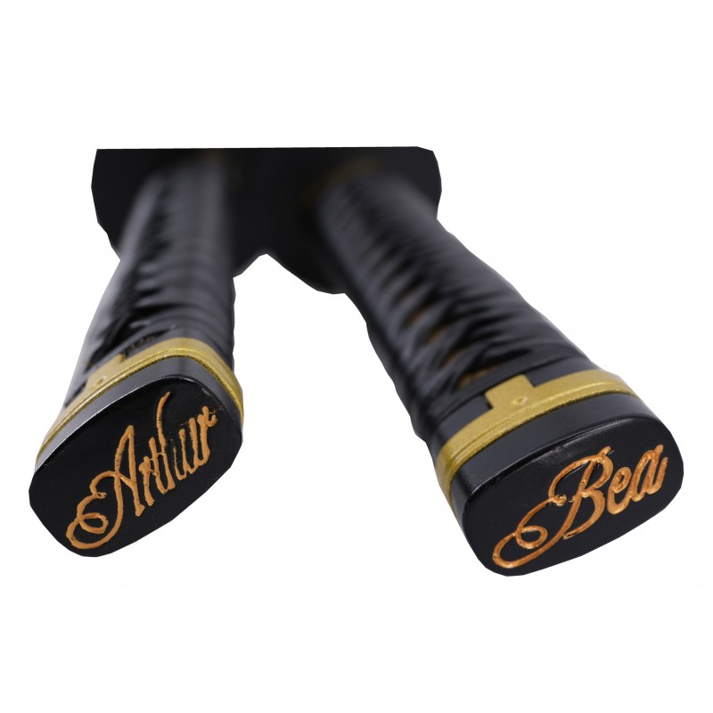 Ανακαλύψτε το σετ katana Deadpool , ένα αντίγραφο 1:1 που θα συναρπάσει τους θαυμαστές του πιο ασεβούς χαρακτήρα στο σύμπαν των κόμικς. Αυτά τα katana με λεπίδα 67 εκατοστών είναι κατασκευασμένα από σατινέ ατσάλι με χρυσές λεπτομέρειες που προσθέτουν μια πινελιά κομψότητας και διακριτικότητας. Η μαύρη θήκη συμπληρώνει τέλεια το σχέδιο, ενώ η πλεγμένη μαύρη λαβή από τεχνητό δέρμα με χρυσές λεπτομέρειες εξασφαλίζει σταθερό και άνετο κράτημα.