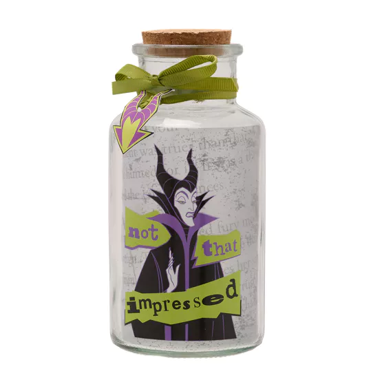 Το διαφανές γυάλινο βάζο παρουσιάζει μια τυπωμένη εικόνα του Maleficent, με τίτλο «Not That Impressed», εσωτερικό σχέδιο φόντου από χαρτί, φιόγκο με πράσινη κορδέλα γύρω από το λαιμό και καπάκι από φελλό. Τα εσωτερικά φώτα LED φωτίζουν τους χώρους διαβίωσης για τους θαυμαστές της Disney όλων των ηλικιών.