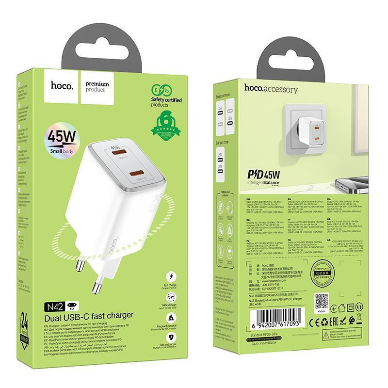Φορτιστής Hoco N42 με δύο θύρες USB-C και υποστήριξη γρήγορης φόρτισης. Η συνολική ισχύς φτάνει τα 45 W, επιτρέποντας τη φόρτιση δύο συσκευών ταυτόχρονα. Υποστηρίζει γρήγορη φόρτιση με PD, QC 3.0, PPS, FCP, AFC και άλλες λύσεις.