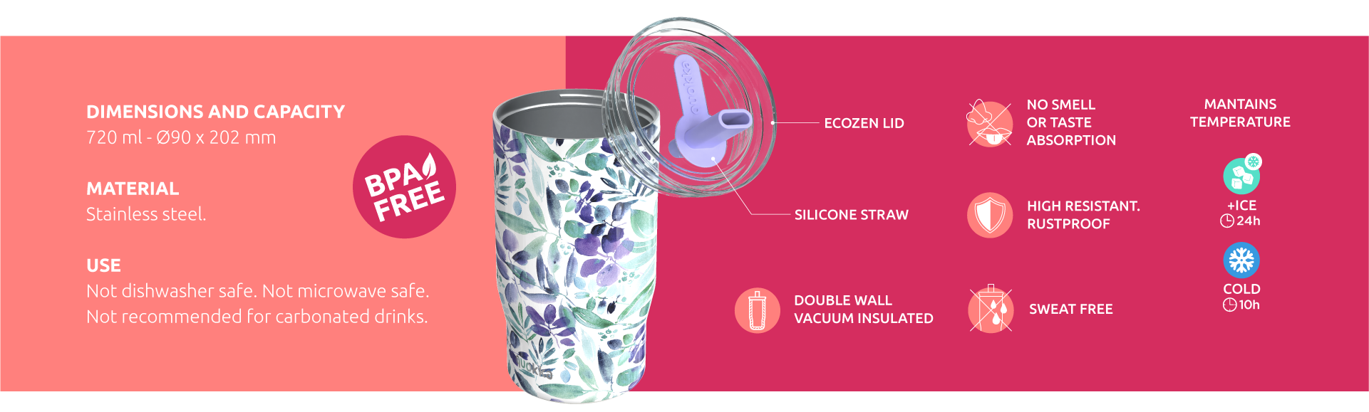 Κατασκευασμένος από υψηλής ποιότητας ανοξείδωτο ατσάλι, είναι ανθεκτικός στη σκουριά και δεν απορροφά οσμές ή γεύσεις, εξασφαλίζοντας τη φρεσκάδα κάθε ροφήματος. Διαθέτει ανθεκτικό καπάκι Ecozen(R) για στεγανή σφράγιση και μαλακό επαναχρησιμοποιούμενο σωλήνα σιλικόνης για άνετη κατανάλωση.